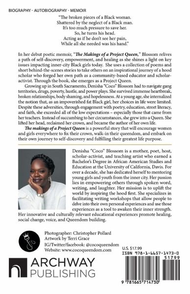 "The broken pieces of a Black woman. Shattered by the neglect of a Black man. It's too much pressure to save her. So, he turns his head. Acting as if he don't see her pain, While all she needed was his hand." In her debut poetic memoir, "The Makings of a Project Queen," Blossom relives a path of self-discovery, empowerment, and healing as she shines a light on key issues impacting inner-city Black girls today. She uses a collection of poems and short behind-the-scenes stories to take others on an inspirational journey of a hood scholar who forged her own path as a community-based educator and scholar-activist. Through the book, she emerges as a Project Queen. Growing up in South Sacramento, Denisha "Coco" Blossom had to navigate gang territories, drugs, poverty, hustle, and power plays. She survived immense heartbreak, broken relationships, body shaming, and hopelessness. At a young age, she internalized the notion that, as an impoverished fat Black girl, her choices in life were limited. Despite these adversities, through engagement with poetry, education, street literacy, and faith, she exceeded all of the low expectations - especially those that came from her teachers. Instead of succumbing to her circumstances, she grew into a Queen. She lifted her head, reclaimed her crown, and became the author of her own life. The makings of a Project Queen is a powerful story that will encourage women and girls everywhere to fix their crown, walk-in their queendom, and embark on their own journey to self-discovery and fulfilling their greatest life purpose.