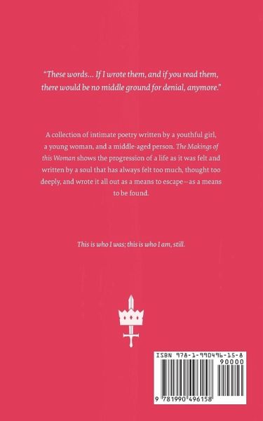 "These words...If I wrote them, and if you read them, there would be no middle ground for denial, anymore." A collection of intimate poetry written by a youthful girl, a young woman, and a middle-aged person. The Makings of this Woman shows the progression of a life as it was felt and written by a soul that has always felt too much, thought too deeply, and wrote it all out as a means to escape-as a means to be found. This is who I was; this is who I am, still.