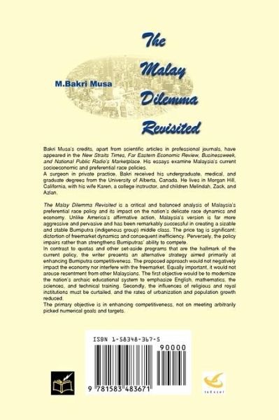 The Malay Dilemma Revisited is a critical and balanced analysis of Malaysia's preferential race policy and its impact on the nation's delicate race dynamics and economy. Unlike America's affirmative action, Malaysia's version is far more aggressive and pervasive and has been remarkably successful in creating a sizable and stable Bumiputra (indigenous group) middle class. The price tag is significant: distortion of freemarket dynamics and consequent inefficiency. Perversely, the policy impairs rather than strengthens Bumiputras' ability to compete. In contrast to quotas and other set-aside programs that are the hallmark of the current policy, the writer presents an alternative strategy aimed primarily at enhancing Bumiputra competitiveness. The proposed approach would not negatively impact the economy nor interfere with the freemarket. Equally important, it would not arouse resentment from other Malaysians. The first objective would be to modernize the nation's archaic educational system to emphasize English, mathematics, the sciences, and technical training. Secondly, the influences of religious and royal institutions must be curtailed, and the rates of urbanization and population growth reduced. The primary objective is in enhancing competitiveness, not on meeting arbitrarily picked numerical goals and targets.