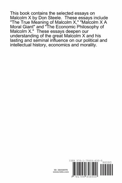 This book contains the selected essays on Malcolm X by Don Steele. These essays include "The True Meaning of Malcolm X," "Malcolm X A Moral Giant" and "The Economic Philosophy of Malcolm X." These essays deepen our understanding of the great Malcolm X and his lasting and seminal influence on our political and intellectual history, economics and morality.