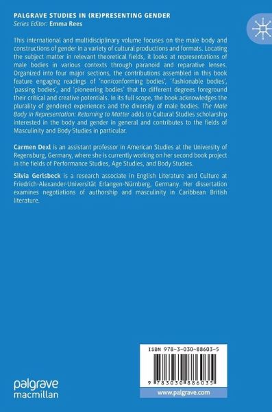 This international and multidisciplinary volume focuses on the male body and constructions of gender in a variety of cultural productions and formats. Locating the subject matter in relevant theoretical fields, it looks at representations of male bodies in various contexts through paranoid and reparative lenses. Organized into four major sections, the contributions assembled in this book feature engaging readings of 'non/conforming bodies', 'fashionable bodies', 'passing bodies', and 'pioneering bodies' that to different degrees foreground their critical and creative potentials. In its full scope, the book acknowledges the plurality of gendered experiences and the diversity of male bodies. The Male Body in Representation: Returning to Matter adds to Cultural Studies scholarship interested in the body and gender in general and contributes to the fields of Masculinity and Body Studies in particular.