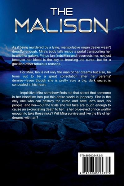 The Malison is a gripping tale of true love, revenge, and sacrifice. As if being murdered by a lying, manipulative organ dealer wasn't dreadful enough, Mira's body falls inside a portal transporting her to another galaxy. Prince Ian finds Mira and resurrects her, not just because her blood is the key to breaking the curse, but for a gazillion other fabulous reasons. For Mira, Ian is not only the man of her dreams, but also he turns out to be a great consolation after her parents' demise-even though she is pretty sure a big, dark secret is concealed in his heart. Inquisitive Mira somehow finds out that secret that someone in her bloodline has put this entire world in jeopardy. She is the only one who can destroy the curse and save Ianc's land, his people, and her-but the trials she will face are tough enough to cause an excruciating death to her. Is her blue-eyed prince worthy enough to take these risks? Will Mira survive and live the life of her dreams with Ian?
