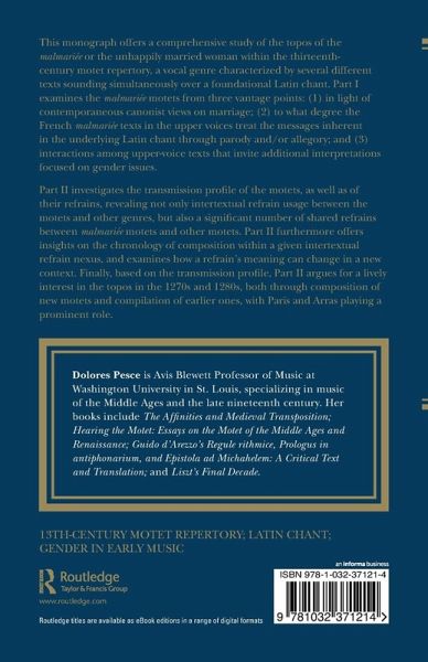 This monograph offers a comprehensive study of the topos of the malmariée or the unhappily married woman within the thirteenth-century motet repertory, a vocal genre characterized by several different texts sounding simultaneously over a foundational Latin chant. Part I examines the malmariée motets from three vantage points: (1) in light of contemporaneous canonist views on marriage; (2) to what degree the French malmariée texts in the upper voices treat the messages inherent in the underlying Latin chant through parody and/or allegory; and (3) interactions among upper-voice texts that invite additional interpretations focused on gender issues.