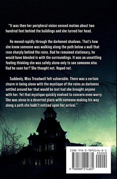 It was then her peripheral vision sensed motion about two hundred feet behind the buildings and she turned her head. He moved rapidly through the darkened shadows. That's how she knew someone was walking along the path below a wall that rose sharply behind the ruins. Had he remained stationary, he would have blended in with the surroundings. It was an unsettling feeling thinking she was safely alone only to see someone else. Had he seen her? She thought not. Hoped not. Suddenly, Miss Treadwell felt vulnerable. There was a certain charm in being alone with the mystique of the ruins as darkness settled around her that would be lost had she brought anyone with her. Yet that mystique quickly evolved to concern even worry. She was alone in a deserted place with someone making his way along a path she hadn't noticed upon her arrival.