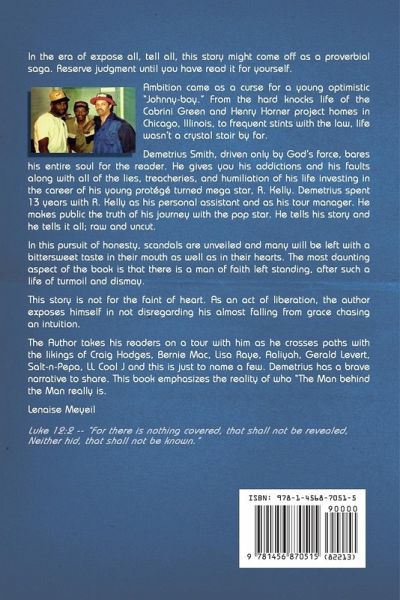 Ambition came as a curse for a young optimistic "Johnny-boy." from the hard knocks life of the Cabrini Green and Henry Horner project homes in Chicago, Illinois, to frequent stints with the law, life wasn't a crystal stair by far. Demetrius Smith, driven only by God's force, bares his entire soul for the reader. He gives you his addications and his faults along with all of the lies, treacheries, and humiliation of his life investing in the career of his young protâegâe turned mega star, R. Kelly. Demetrius spent 13 years with R. Kelly as his personal assistant and as his tour manager. He makes public the truth of his journey with the pop star. He tells his story and he tells it all: raw and uncut.