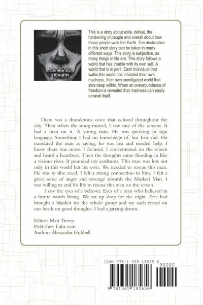 This is a story about exile, defeat, the hard wiring of people and overall about how those people walk the Earth. The destruction in this short story can be taken in many different ways. This story is subjective, as many things in life are. This story follows a world that has trouble with its own self. A world that is in peril, blinded by technology and progression. A masked man has decided to put the world in his hands.
