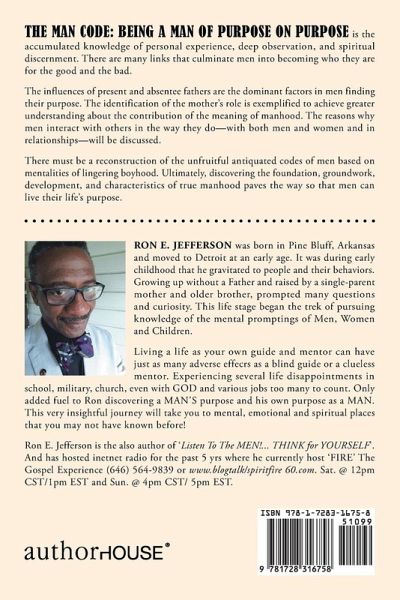 The Man Code: Being a Man of Purpose on Purpose is the accumulated knowledge of personal experience, deep observation, and spiritual discernment. There are many links that culminate men into becoming who they are for the good and the bad. The influences of present and absentee fathers are the dominant factors in men finding their purpose. The identification of the mother's role is exemplified to achieve greater understanding about the contribution of the meaning of manhood. The reasons why men interact with others in the way they do-with both men and women and in relationships-will be discussed. There must be a reconstruction of the unfruitful antiquated codes of men based on mentalities of lingering boyhood. Ultimately, discovering the foundation, groundwork, development, and characteristics of true manhood paves the way so that men can live their life's purpose.