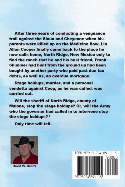 After three years of conducting a vengeance trail against the Sioux and Cheyenne when his parents were killed up on the Medicine Bow, Lin Allan Cooper finally came back to the place he now calls home, North Ridge, New Mexico only to find the ranch that he and his best friend, Frank Shimmer had built from the ground up had been bought by another party who paid past due tax debts, as well as, an overdue mortgage. Stage holdups, murder, and a personal vendetta against Coop, as he was called was carried out. Will the sheriff of North Ridge, county of Malone stop the stage holdups? Or, will the Army who the governor had called in to intervene stop the stage holdups? ' Only time will tell.