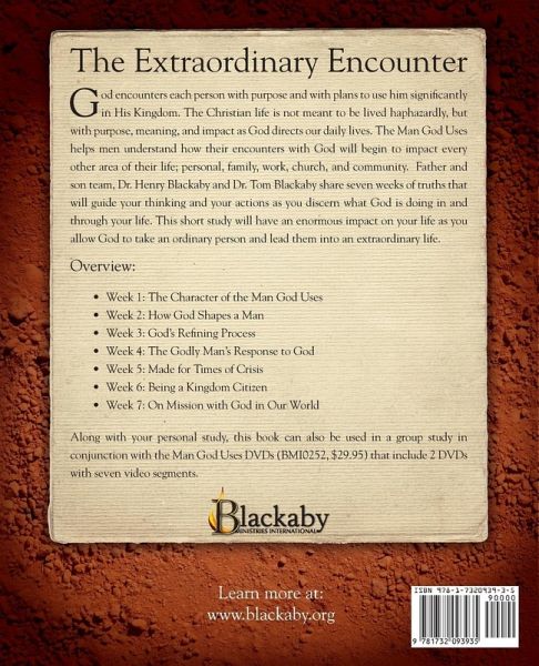 The Christian life is not meant to be lived haphazardly, but with purpose, meaning, and impact as God directs our daily lives. The Man God Uses helps men understand how their encounters with God will begin to impact every other area of their life: personal, family, work, church, and community. Father and son team, Dr. Henry Blackaby and Dr. Tom Blackaby share seven weeks of truths that will guide your thinking and actions as you discern what God is doing in and through your life. This short study will have an enormous impact on your life as you allow God to lead you into an extraordinary life.