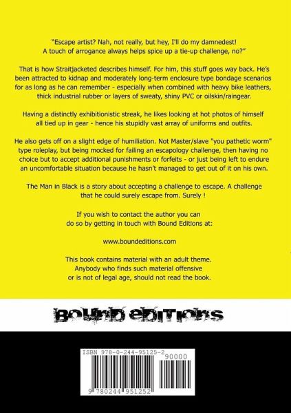 Straitjacketed is attracted to kidnap and moderately long-term enclosure type bondage scenarios - especially when combined with heavy bike leathers, thick industrial rubber or layers of sweaty, shiny PVC or oilskin/raingear. Having a distinctly exhibitionistic streak, he likes looking at hot photos of himself all tied up in gear - hence his stupidly vast array of uniforms and outfits. He also gets off on a slight edge of humiliation. Not Master/slave "you pathetic worm" type roleplay, but being mocked for failing an escapology challenge, then having no choice but to accept additional punishments or forfeits - or just being left to endure an uncomfortable situation because he hasn't managed to get out of it on his own. The Man in Black is a story about accepting a challenge to escape. A challenge that he could surely escape from. Surely !