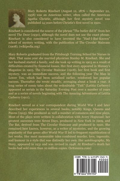 Mary Roberts Rinehart (August 12, 1876 – September 22, 1958) was an American writer, often called the American Agatha Christie, although her first mystery novel was published 14 years before Christie's first novel in 1920. Rinehart is considered the source of the phrase "The butler did it" from her novel The Door (1930), although the novel does not use the exact phrase. Rinehart is also considered to have invented the "Had-I-But-Known" school of mystery writing, with the publication of The Circular Staircase (1908). (wikipedia.org) Mary Roberts graduated from the Pittsburgh Training School for Nurses in 1896. That same year she married physician Stanley M. Rinehart. She and her husband started a family, and she took up writing in 1903 as a result of difficulties created by financial losses. Her first story appeared in Munsey’s Magazine in 1903. The Circular Staircase (1908), her first book and first mystery, was an immediate success, and the following year The Man in Lower Ten, which had been serialized earlier, reinforced her popular success. Thereafter she wrote steadily, averaging about a book a year. A long series of comic tales about the redoubtable "Tish" (Letitia Carberry) appeared as serials in the Saturday Evening Post over a number of years and as a series of novels beginning with The Amazing Adventures of Letitia Carberry (1911). Rinehart served as a war correspondent during World War I and later described her experiences in several books, notably Kings, Queens and Pawns (1915). She produced as well a number of romances and nine plays. Most of the plays were written in collaboration with Avery Hopwood; her greatest successes were Seven Days, produced in New York in 1909, and The Bat, derived from The Circular Staircase and produced in 1920. She remained best known, however, as a writer of mysteries, and the growing popularity of that genre after World War II led to frequent republication of her works. Her most memorable tales combined murder, love, ingenuity, and humour in a style that was distinctly her own. Her autobiography, My Story, appeared in 1931 and was revised in 1948. At Rinehart’s death her books had sold more than 10 million copies. (britannica.com)