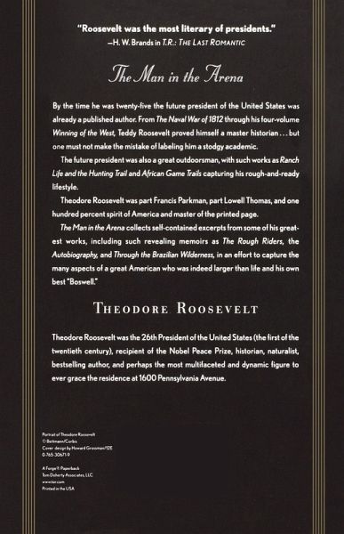 The first compilation of selections from the major works of Teddy Roosevelt since the resurgence in his popularity due to the major award-winning/bestselling biographies by Edmond Morris and H. W. Brands By the time he was twenty-five the future president of the United States was already a published author. From The Naval War of 1812 through his four-volume Winning of the West, Teddy Roosevelt proved himself a master historian...but one must not make the mistake of labeling him a stodgy academic. The future president was also a great outdoorsman, with such works as Ranch Life and the Hunting Trail and African Game Trails capturing his rough and ready lifestyle. Theodore Roosevelt was part Francis Parkman, part Lowell Thomas, and one hundred percent spirit of America and master of the printed page. The Man in the Arena collects self-contained excerpts from some of his greatest works, including such revealing memoirs as The Rough Riders, the Autobiography, and Through the Brazilian Wilderness, in an effort to capture the many aspects of a great American who was indeed larger than life and his own best "Boswell." "This collection of his writings gives credence to Henry Adams's assertion that Roosevelt was "pure Act": there was, it seems, no subject (or foe) he was afraid to tackle. " - Publishers Weekly