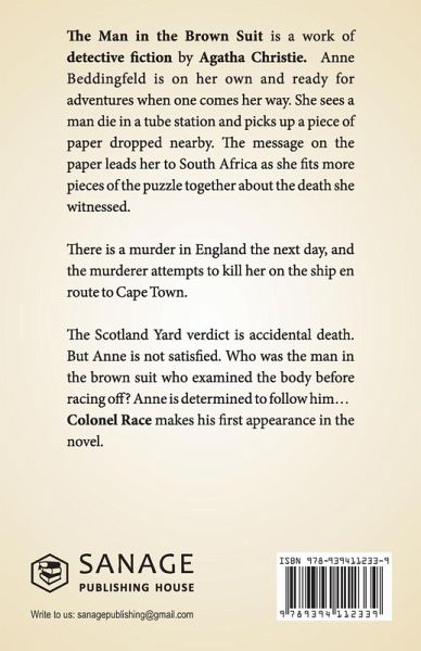 The Man in the Brown Suit is a work of detective fiction by Agatha Christie. Anne Beddingfeld is on her own and ready for adventures when one comes her way. She sees a man die in a tube station and picks up a piece of paper dropped nearby. The message on the paper leads her to South Africa as she fits more pieces of the puzzle together about the death she witnessed. There is a murder in England the next day, and the murderer attempts to kill her on the ship en route to Cape Town. The Scotland Yard verdict is accidental death. But Anne is not satisfied. Who was the man in the brown suit who examined the body before racing off? Anne is determined to follow him...Colonel Race makes his first appearance in the novel.