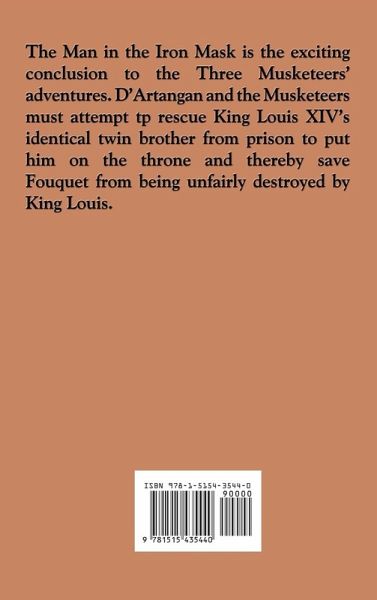 The Man in the Iron Mask is the exciting conclusion to the Three Musketeers' adventures. D'Artangan and the Musketeers must attempt tp rescue King Louis XIV's identical twin brother from prison to put him on the throne and thereby save Fouquet from being unfairly destroyed by King Louis. Dumas was the most generous, large-hearted being in the world. He also was the most delightfully amusing and egotistical creature on the face of the earth. His tongue was like a windmill - once set in motion, you never knew when he would stop, especially if the theme was himself. - Watts Phillips