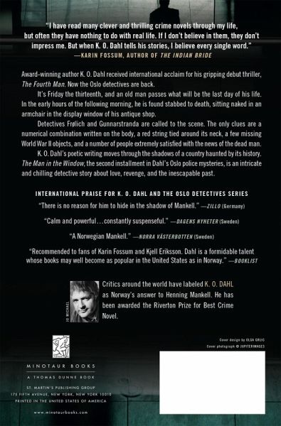 A cryptic murder resurrects dark memories of past atrocities in this latest mystery from the master of Norwegian crime writing. Award-winning author K. O. Dahl received international acclaim for his gripping debut thriller, The Fourth Man, which introduced readers to Detective Inspector Frank Frølich and Detective Chief Inspector Gunnarstranda. Now the Oslo detectives are back. It's Friday the thirteenth, the Norwegian capital is enveloped in freezing cold, and Reidar Folke Jespersen passes what will be the last day of his life. The aging antique dealer leaves home and takes a taxi to a nearby café. A few hours later, through the window of the café, he watches his wife enter the door to a flat on the other side of the street, where her lover lives. In the early hours of the following morning, Jespersen is found stabbed to death, sitting naked in an armchair in the display window of his antique shop. Detectives Frølich and Gunnarstranda are called to the scene. Their only clues are a numerical combination written in ink on the body of the dead man, a red string tied around his neck, a few missing World War II objects, and a number of people extremely satisfied with the news of the man's death. Questions of love and betrayal, loyalty and guilt consume the investigation, just as they fill the private lives of the investigators. K. O. Dahl's dark and poetic writing moves through the shadows of one country's history---a country where victims, perpetrators, and even police officers are haunted by the past, still trying to cope with dark memories of the Nazi occupation. The Man in the Window, the second installment in Dahl's Oslo police mysteries, is an intricate and chilling detective story about love, revenge, and the inescapable past.