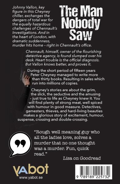 A boudoir mystery of detection, action ... and amour. Johnny Vallon exchanges the dangers of total war for the equally hazardous challenges of Chennault's Investigations. And in the heart of London, murder hits home - right in Chennault's office. Chennault, himself, owner of the flourishing detective agency, is found slumped over his desk. Heart trouble is the official diagnosis. But Vallon knows better, and proves it. * * * During the short period of fifteen years Peter Cheyney managed to write more than thirty books. Resulting in sales which run into millions of copies. Cheyney's stories are about the grim, the slick, the seductive and the amusing - just true to life as Cheyney knew it. You will find plenty of strong meat, well spiced with humour in good measure. Detectives, gamesters, thieves, and hard-living beauties makes a glorious story of excitement, humour, suspense, crossing and double-crossing.