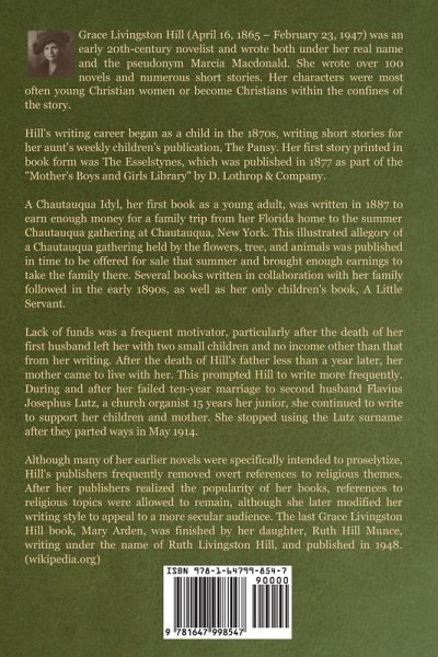 Grace Livingston Hill (April 16, 1865 – February 23, 1947) was an early 20th-century novelist and wrote both under her real name and the pseudonym Marcia Macdonald. She wrote over 100 novels and numerous short stories. Her characters were most often young Christian women or become Christians within the confines of the story. Hill's writing career began as a child in the 1870s, writing short stories for her aunt's weekly children's publication, The Pansy. Her first story printed in book form was The Esselstynes, which was published in 1877 as part of the "Mother's Boys and Girls Library" by D. Lothrop & Company. A Chautauqua Idyl, her first book as a young adult, was written in 1887 to earn enough money for a family trip from her Florida home to the summer Chautauqua gathering at Chautauqua, New York. This illustrated allegory of a Chautauqua gathering held by the flowers, tree, and animals was published in time to be offered for sale that summer and brought enough earnings to take the family there. Several books written in collaboration with her family followed in the early 1890s, as well as her only children's book, A Little Servant. Lack of funds was a frequent motivator, particularly after the death of her first husband left her with two small children and no income other than that from her writing. After the death of Hill's father less than a year later, her mother came to live with her. This prompted Hill to write more frequently. During and after her failed ten-year marriage to second husband Flavius Josephus Lutz, a church organist 15 years her junior, she continued to write to support her children and mother. She stopped using the Lutz surname after they parted ways in May 1914. Although many of her earlier novels were specifically intended to proselytize, Hill's publishers frequently removed overt references to religious themes. After her publishers realized the popularity of her books, references to religious topics were allowed to remain, although she later modified her writing style to appeal to a more secular audience. The last Grace Livingston Hill book, Mary Arden, was finished by her daughter, Ruth Hill Munce, writing under the name of Ruth Livingston Hill, and published in 1948. (wikipedia.org)