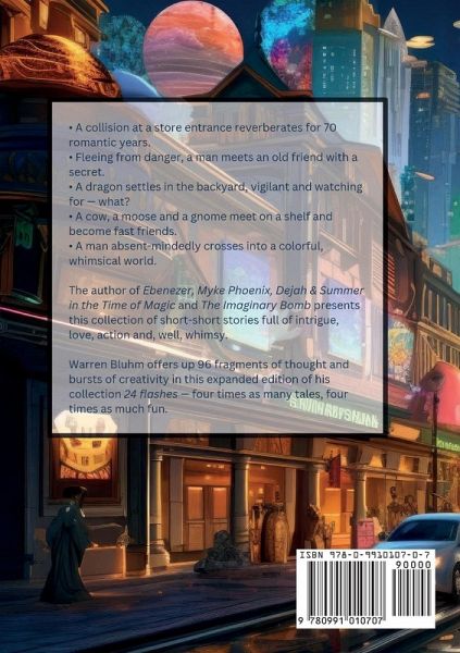 A collision at a store entrance reverberates for 70 romantic years. Fleeing from danger, a man meets an old friend with a secret. A dragon settles in the backyard, vigilant and watching for - what? A cow, a moose and a gnome meet on a shelf and become fast friends. A man absent-mindedly crosses into a colorful, whimsical world. The author of Ebenezer, Myke Phoenix, Dejah & Summer in the Time of Magic and The Imaginary Bomb presents this collection of short-short stories full of intrigue, love, action and, well, whimsy. Warren Bluhm offers up 96 fragments of thought and bursts of creativity in this expanded edition of his collection 24 flashes - four times as many tales, four times as much fun.