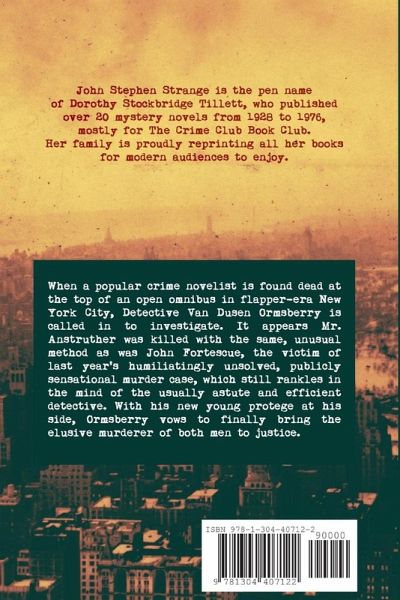 When a popular crime novelist is found dead at the top of an open omnibus in flapper-era New York City, Detective Van Dusen Ormsberry is called in to investigate. It appears Mr. Anstruther was killed with the same, unusual method as was John Fortescue, the victim of last year's humiliatingly unsolved, publicly sensational murder case, which still rankles in the mind of the usually astute and efficient detective. With his new young protege at his side, Ormsberry vows to finally bring the elusive murderer of both men to justice. John Stephen Strange is the pen name of Dorothy Stockbridge Tillett (1896-1983), who wrote 22 mystery novels from 1928 to 1976, mostly for the Crime Club. Considered classics of their genre, her family has proudly dusted them off for reprinting. For more information about John Stephen Strange, see our website: JSStrangeMysteryNovels.com