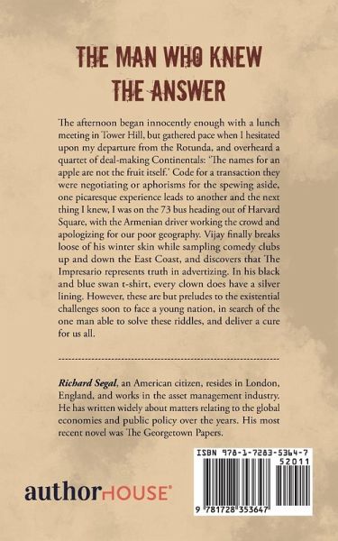 The afternoon began innocently enough with a lunch meeting in Tower Hill, but gathered pace when I hesitated upon my departure from the Rotunda, and overheard a quartet of deal-making Continentals: 'The names for an apple are not the fruit itself.' Code for a transaction they were negotiating or aphorisms for the spewing aside, one picaresque experience leads to another and the next thing I knew, I was on the 73 bus heading out of Harvard Square, with the Armenian driver working the crowd and apologizing for our poor geography. Vijay finally breaks loose of his winter skin while sampling comedy clubs up and down the East Coast, and discovers that The Impresario represents truth in advertizing. In his black and blue swan t-shirt, every clown does have a silver lining. However, these are but preludes to the existential challenges soon to face a young nation, in search of the one man able to solve these riddles, and deliver a cure for us all.