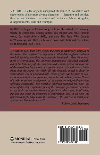 VICTOR HUGO'S long and chequered life (1802-85) was filled with experiences of the most diverse character - literature and politics, the court and the street, parliament and the theatre, labour, struggles, disappointments, exile and triumphs. --- In 1855 he began a 15-year-long exile on the island of Guernsey, where he completed, among others, his longest and most famous work, Les Misérables (1862), and also The Man Who Laughs (L'Homme qui rit; 1869), also known as "By Order of the King", a historic novel with fictional characters, set in England 1688-1705. --- .it will be seen that, here again, the story is admirably adapted to the moral. The constructive ingenuity exhibited throughout is almost morbid. Nothing could be more happily imagined. than the adventures of Gwynplaine, the itinerant mountebank, snatched suddenly out of his little way of life, and installed without preparation as one of the hereditary legislators of a great country. It is with a very bitter irony that the paper, on which all this depends, is left to float for years at the will of wind and tide. What, again, can be finer in conception than that voice from the people heard suddenly in the House of Lords, in solemn arraignment of the pleasures and privileges of its splendid occupants? The horrible laughter, stamped for ever "by order of the king" upon the face of this strange spokesman of democracy, adds yet another feature of justice to the scene; in all time, travesty has been the argument of oppression; and, in all time, the oppressed might have made this answer: "If I am vile, is it not your system that has made me so?" ---Robert Louis Stevenson