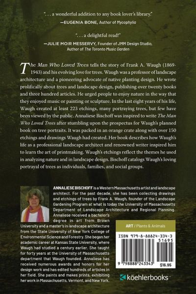 "A powerful and beautifully illustrated homage to a remarkable pioneer in sustainable urban forest management." -Dr. Diana Beresford-Kroeger, Author of Our Green Heart ". . . a wonderful addition to any book lover's library." -Eugenia Bone, Author of Mycophylia ". . . a delightful read!" -Julie Moir Messervy, founder of JMM Design Studio, author of The Toronto Music Garden The Man Who Loved Trees tells the story of Frank A. Waugh (1869-1943) and his evolving love for trees. Waugh was a professor of landscape architecture and a pioneering advocate of native planting design. He wrote prolifically about trees and landscape design, publishing over twenty books and three hundred articles. He urged people to enjoy nature in the way that they enjoyed music or painting or sculpture. In the last eight years of his life, Waugh created at least 223 etchings, many portraying trees, but few have been viewed by the public. Annaliese Bischoff was inspired to write The Man Who Loved Trees after stumbling upon the prospectus for Waugh's planned book on tree portraits. It was packed in an orange crate along with over 150 etchings and drawings Waugh had created. Her book describes how Waugh's life as a professional landscape architect and renowned writer inspired him to learn the art of printmaking. Waugh's etchings reflect the themes he used in analyzing nature and in landscape design. Bischoff catalogs Waugh's loving portrayal of trees as individuals, families, and social groups.