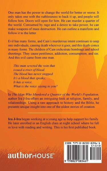 One man has the power to change the world for better or worse. It only takes one with the ruthlessness to back it up, and people will follow him. Doors will open for him. He can murder a quarter of the world. Consumed by rage and a desire to take power, he can make weapons of mass destruction. He can outline a manifesto and follow it to the letter. Evil has many forms, and Cain's murderous intent continues to seep into individuals, causing death wherever it goes, and this death comes in many forms. The children of Cain orchestrate bombings and school shootings. They cause pestilence, addiction, consumption, and sin. And this evil came from one man. This man severed the vein that issued a river of blood. The blood has never stopped. It's a blood that speaks; It has a voice. What is the voice saying to you? In The Man Who Murdered a Quarter of the World's Population, author Ira J-Ira offers an intriguing look at religion, family, and relationships. Using a raw approach to history and the Bible, he presents unique insight into one of the oldest stories of creation.