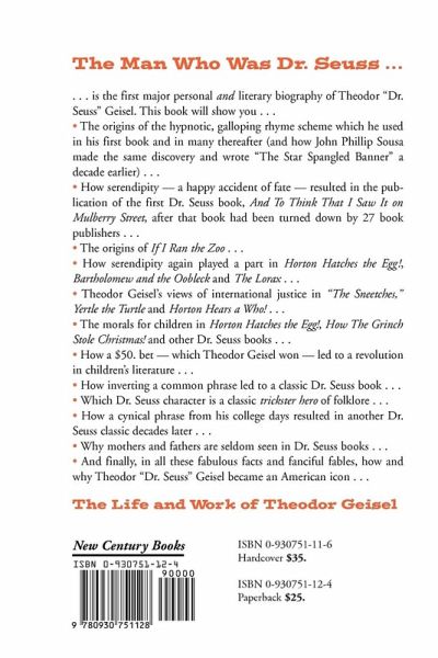 The Man Who Was Dr. Seuss is the first major personal and literary biography of theodor "Dr. Seuss" Geisel. It describes the origins of the rhyme scheme he used for many of his books; his views of international justice; the morals for children in his books; why parents are seldom seen in Dr. Seuss books and finally, among fabulouse facts and fanciful fables, how and why Dr. Seuss eventually became an American icon.