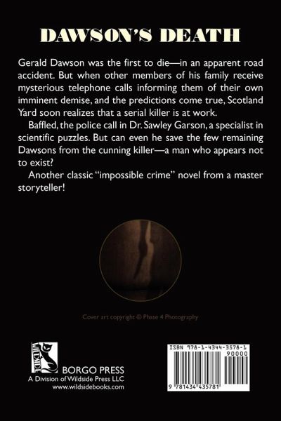 Gerald Dawson was the first to die--in an apparent road accident. But when other members of his family receive mysterious telephone calls informing them of their own imminent demise, and the predictions come true, Scotland Yard soon realizes that a serial killer is at work. Baffled, the police call in Dr. Sawley Garson, a specialist in scientific puzzles. But can even he save the few remaining Dawsons from the cunning killer--a man who appears not to exist? Another classic "impossible crime" novel from a master storyteller.
