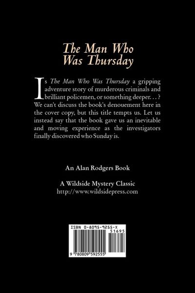 A WILD, MAD, HILARIOUS AND PROFOUNDLY MOVING TALE: It is very difficult to classify The Man Who was Thursday. It is possible to say that it is a gripping adventure story of murderous criminals and brilliant policemen; but it was to be expected that the author of the Father Brown stories should tell a detective story like no one else. On this level, therefore, The Man Who was Thursday succeeds superbly; if nothing else, it is a magnificent tour-de-force of suspense-writing. However, the reader will soon discover that it is much more than that. Carried along on the boisterous rush of the narrative by Chesterton's wonderful high-spirited style, he will soon see that he is being carried into much deeper waters than he had planned on; and the totally unforeseeable denouement will prove for the modern reader, as it has for thousands of others since 1908 when the book was first published, an inevitable and moving experience, as the investigators finally discover who Sunday is. Like most of Chesterton's fiction, the story includes some Christian allegory.
