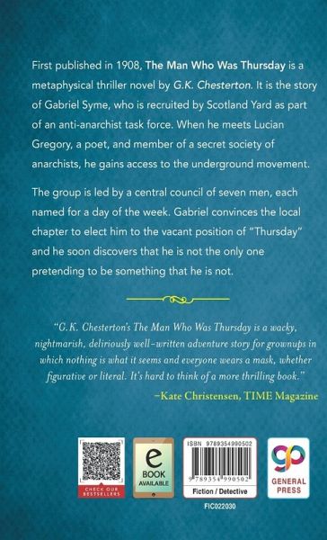 First published in 1908, 'The Man Who Was Thursday' is a metaphysical thriller novel by G.K. Chesterton. It is the story of Gabriel Syme, who is recruited by Scotland Yard as part of an anti-anarchist task force. When he meets Lucian Gregory, a poet, and member of a secret society of anarchists, he gains access to the underground movement. The group is led by a central council of seven men, each named for a day of the week. Gabriel convinces the local chapter to elect him to the vacant position of "Thursday" and he soon discovers that he is not the only one pretending to be something that he…mehr