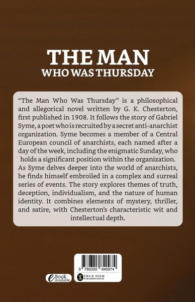 ""The Man Who Was Thursday"" is a philosophical and allegorical novel written by G. K. Chesterton, first published in 1908. It follows the story of Gabriel Syme, a poet who is recruited by a secret anti-anarchist organization. Syme becomes a member of a Central European council of anarchists, each named after a day of the week, including the enigmatic Sunday, who holds a significant position within the organization. As Syme delves deeper into the world of anarchists, he finds himself embroiled in a complex and surreal series of events. The story explores themes of truth, deception, individualism, and the nature of human identity. It combines elements of mystery, thriller, and satire, with Chesterton's characteristic wit and intellectual depth.