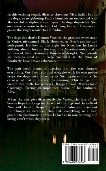 In this exciting sequel, disaster threatens Nico, ballot boy to the doge, as neighboring Padua launches an undeclared war. Mistrustful of diplomats and spies, the doge dispatches Nico on a secret mission to the court of King Louis of Hungary to gauge the king's resolve to aid Padua. The doge also drafts Donato Venturi, the greatest swordsman in Venice, nicknamed Black Hercules, as Nico's adviser and bodyguard. It's love at first sight for Nico, but he knows nothing about Donato, the son of a Venetian noble and a princess of Mali. Assuming Donato is straight, Nico guards his feelings until an unlikely encounter at the Prior of Brotherly Love proves otherwise. The pair steal moments together, but the war changes everything. Cutthroat political struggles with his own nobles keeps the doge busy in Venice as Nico again confronts the carnage of battle, testing his cunning. This brings him face-to-face with his nemeses, Ruggiero and Marcantonio Gradenigo, forcing an unplanned rescue of his soulmate, Alex. When the war goes disastrously for Venice, the fate of the Serene Republic hangs on the will of the doge and the skills of Nico and Donato. Desperate to defeat Padua and drive out the Hungarian invaders, they risk everything in a final gambit to checkmate in three. In love as in war, winning and losing aren't what they seem.