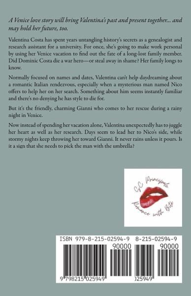 A Venice love story will bring Valentina's past and present together... and may hold her future, too. Valentina Costa has spent years untangling history's secrets as a genealogist and research assistant for a university. For once, she's going to make work personal by using her Venice vacation to find out the fate of a long-lost family member. Did Dominic Costa die a war hero—or steal away in shame? Her family longs to know. Normally focused on names and dates, Valentina can't help daydreaming about a romantic Italian rendezvous, especially when a mysterious man named Nico offers to help her on her search. Something about him seems instantly familiar and there's no denying he has style to die for. But it's the friendly, charming Gianni who comes to her rescue during a rainy night in Venice. Now instead of spending her vacation alone, Valentina unexpectedly has to juggle her heart as well as her research. Days seem to lead her to Nico's side, while stormy nights keep throwing her toward Gianni. It never rains unless it pours. Is it a sign that she needs to pick the man with the umbrella?