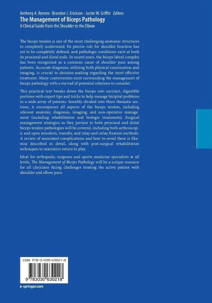 Part I: Anatomy, Imaging and Function of the Biceps Tendon.- Anatomy of the biceps tendon: From origin to insertion.- How to Diagnose Biceps Tendon Pathology.- Imaging the biceps tendon at both the shoulder and elbow: What to look out for.- Ultrasound and the Biceps Tendon: Diagnostic and Therapeutic Benefits.- Role of the Biceps Tendon as a Humeral Head Depressor.- The role of the biceps tendon as a humeral head depressor.- The role of the biceps tendon in the overhead athlete.- Part II: Proximal Biceps Tendon Conditions.- Biceps Tendinopathy: Causes and Solutions to This Problem.- Nonsurgical Management of Proximal Biceps Pathology.- SLAP tears, diagnosis and management.- The incarcerating biceps tendon.- Anterior shoulder pain in the throwing athlete: SLAP repair vs. biceps tenodesis? Or both.- Injuries to the Biceps Pulley.- Managing Biceps Pathology With Rotator Cuff Tears.- Managing Biceps/SLAP Pathology with Associated Shoulder Instability.- Arthroscopic vs. open tenodesis: Which patients need which? .- Inlay Versus Onlay Fixation Methods for Proximal Biceps Tenodesis.- The biceps transfer: A different perspective on treatment.- Complications Following Proximal Biceps Tenodesis.- Post-Operative Rehabilitation: Biceps Tenodesis.- Part III: Distal Biceps Tendon Conditions.- Management of Partial Thickness Distal Biceps Tears.- Complete Distal Biceps Ruptures.- Methods of fixation for distal biceps repair: What does the evidence show?.- Chronic and Revision Distal Biceps Reconstruction.- Complications of Distal Biceps Tendon Repair.- How to rehab a patient following a distal biceps repair
