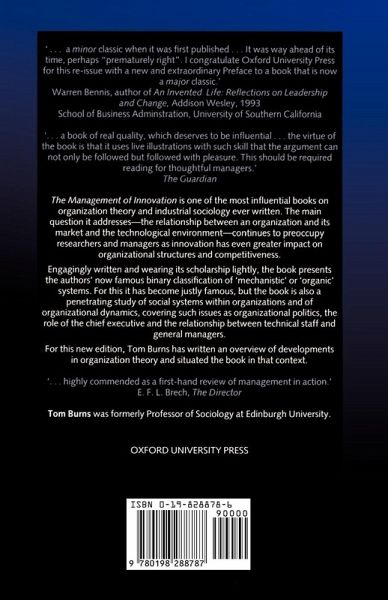 The management of Innovation is one of the most influential books on organization theory and industrial sociology ever written. The main question it addresses--the relationship between an organization and its market and the technological environment--continues to preoccupy researchers and managers as innovation has even greater impact on organizational structures and competitiveness.