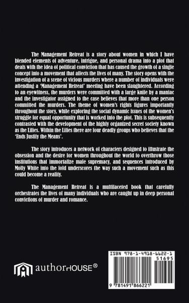 The Management Retreat is a story about women in which I have blended elements of adventure, intrigue, and personal drama into a plot that deals with the idea of political conviction that has caused the growth of a single concept into a movement that affects the lives of many. The story opens with the investigation of a scene of vicious murders where a number of individuals were attending a 'Management Retreat' meeting have been slaughtered. According to an eyewitness, the murders were committed with a large knife by a maniac and the investigator assigned to the case believes that more than one person committed the murders. The theme of women's rights figures importantly throughout the story, while exploring the social dynamic issues of the women's struggle for equal opportunity that is worked into the plot. This is subsequently contrasted with the development of the highly organized secret society known as the Lilies. Within the Lilies there are four deadly groups who believes that the 'Ends Justify the Means'. The story introduces a network of characters designed to illustrate the obsession and the desire for women throughout the world to overthrow those institutions that immortalize male supremacy, and sequences introduced by Molly White into the fold underscores the way such a movement such as this could become a reality. The Management Retreat is a multifaceted book that carefully orchestrates the lives of many individuals who are caught up in deep personal convictions of murder and romance.