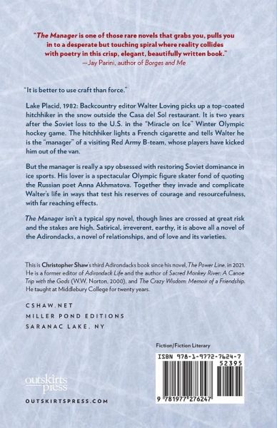 Spies in the Adirondacks. Lake Placid, 1982. Backcountry editor Walter Loving picks up a top-coated hitchhiker in the snow outside the Casa del Sol restaurant two years after the Soviet loss to the U.S. in the "Miracle on Ice" Winter Olympic hockey game. The hitchhiker tells Walter he is the "manager" of a visiting Red Army B-team, whose players have kicked him out of the van. But the manager is really a spy obsessed with restoring Soviet dominance in ice sports. His lover is a spectacular Olympic figure skater fond of quoting the Russian poet Anna Akhmatova. Together they invade and complicate Walter's life in ways that test his reserves of courage and resourcefulness, with far reaching effects. The Manager isn't a typical spy novel, though lines are crossed at great risk and the stakes are high. The narrative moves rapidly to Montreal, Siberia, Sarajevo, and back again to the Adirondacks. Supporting characters include environmental activists, woodsmen, and a wisecracking journalist, Sally, who is one of Walter's former girlfriends. Satirical, irreverent, earthy, The Manager is above all a novel of the Adirondacks, a novel of relationships, and of love and its varieties.