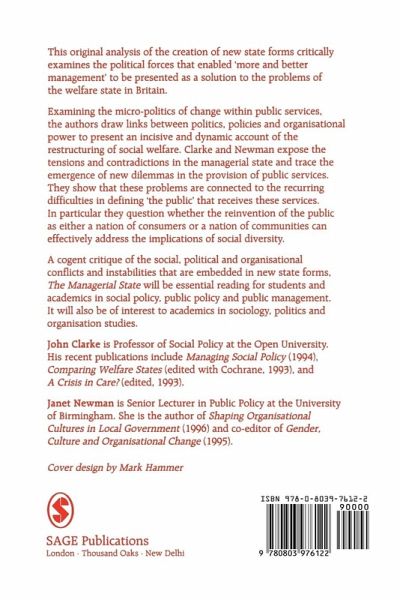 Examining the micro-politics within public service, the authors draw links between politics, policies and organizational power to present an incisive and dynamic account of the restructuring of social welfare. Clarke and Newman expose the tensions and contradictions in the managerial state and trace the emergence of new dilemmas in the provision of public services. They show that these problems are connected to the recurring difficulties in defining `the public' that receives these services. In particular they question whether the reinvention of the public as either a nation of consumers or a nation of communities can effectively address the implications of social diversity.