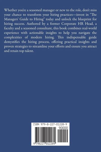 Whether you're a seasoned manager or new to the role, don't miss your chance to transform your hiring practices-invest in "The Managers' Guide to Hiring" today and unlock the blueprint for hiring success. Authored by a former Corporate HR Head, a faculty and a seasoned consultant, this book combines real-world experience with actionable insights to help you navigate the complexities of modern hiring. This indispensable guide demystifies the hiring process, offering practical insights and proven strategies to streamline your efforts and ensure you attract and retain top talent.