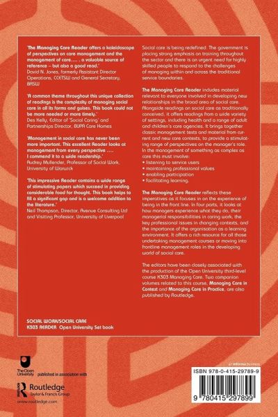This Reader includes material relevant to everyone involved in developing new relationships in health and social care. Alongside articles on social care as traditionally conceived, it offers articles from a wide variety of settings, including those in health and education. It brings together classic management texts and material with a management focus, providing a stimulating range of perspectives on the manager's role. In the management of something as complex as care, this must involve: * listening to service users * maintaining professional values * enabling participation * facilitating learning. The Managing Care Reader reflects these imperatives as it focuses in on the experience of being in the front line. In four parts, it looks at how managers experience what they do, their managerial responsibilities, the key professional issues, and the importance of the organisational environment. It offers a rich resource for all those undertaking management courses or moving into frontline management roles in the new world of social care.