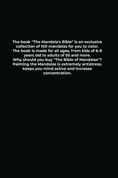 The Mandala's Bible The book "The Mandala's Bible" is an exclusive collection of 100 mandalas for you to color.The book is made for all ages, from kids of 6-8 years old to adults of 50 and more.Why should you buy "The Bible of Mandalas"?Painting the Mandalas is extremely antistress, keeps you mind active and increase concentration.