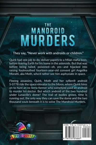 They say, "Never work with androids or children." Quirk had one job to do, deliver papers to a Milan mafia boss, before leaving Earth for his home in the asteroids. But that was before being tailed, poisoned-oh, yes-and hijacked into raising foulmouthed fourteen-year-old convent girl Angelika Moratti, aka Moth, who'd rather see him asphyxiate in space. Fleeing assassins, Quirk, Moth and her syRen® android S-0778 ride the space elevator to the Moon, where Quirk hires on to hunt an ex-terra-former who somehow used an android to murder his doctor. But which android of the two hundred under Lunaville's dome? The trail of bodies grows, time is running out; the only way they can save the dome and the two thousand souls beneath it is to solve The Mandroid Murders.