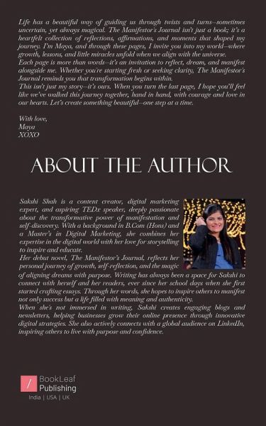 Sakshi Shah is a content creator, digital marketing expert, and aspiring TEDx speaker, deeply passionate about the transformative power of manifestation and self-discovery. With a background in B.Com (Hons) and a Masters in Digital Marketing, she combines her expertise in the digital world with her love for storytelling to inspire and educate. Her debut novel, The Manifestor's Journal, reflects her personal journey of growth, self-reflection, and the magic of aligning dreams with purpose. Writing has always been a space for Sakshi to connect with herself and her readers, ever since her school days when she first started crafting essays. Through her words, she hopes to inspire others to manifest not only success but a life filled with meaning and authenticity. When she's not immersed in writing, Sakshi creates engaging blogs and newsletters, helping businesses grow their online presence through innovative digital strategies. She also actively connects with a global audience on LinkedIn, inspiring others to live with purpose and confidence.