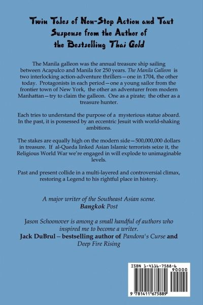The Manila galleon was the annual treasure ship sailing between Acapulco and Manila for 250 years. THE MANILA GALLEON is dovetailing adventures:one set in 1704, the other today. Protagonists in each-one a privateer from the frontier town of New York, the other an adventurer from modern Manhattan-try to claim the prize. Each tries to understand the purpose of a mysterious statue aboard. In the past, it is possessed by a Jesuit with earth-shaking ambitions. The stakes are equally high on the modern side-a fortune in treasure. If al-Queda linked Asian terrorists seize it, the Religious World War will explode to unimaginable levels. Past and present coverge in a multi-layered climax, restoring a legend to his rightful place in history. "A MAJOR WRITER OF THE SOUTHEAST ASIAN SCENE"-Bangkok POST. "JASON SCHOONOVER IS AMONG A SMALL HANDFUL OF AUTHORS WHO INSPIRED ME TO BECOME A WRITER"-Jack DuBrul, bestselling author of PANDORA'S CURSE and DEEP FIRE RISING. Website: jasonschoonover.com