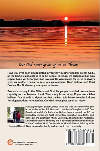 Have you ever been disappointed in yourself? In other people? So has God...all the time. He appoints us to be his people; in return, we disappoint him on a regular basis, yet he forgives and loves us. He wants more for us, so he always gives us another chance to keep our appointment. Don't believe me? Read Exodus. Our God never gives up on us. Never. Exodus is a story in the Bible about God, his people, and their escape from captivity to the Promised Land. Their story is our story, if you are a Bible believer. Our story is so significant that the Lord told Moses to write it down for all generations to remember. Our God never gives up on us. Never.