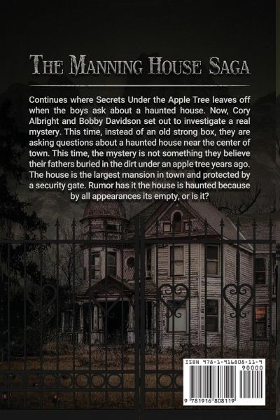 The Manning House Saga continues where Secrets Under the Apple Tree leaves off when the boys ask about a haunted house. Now, Cory Albright and Bobby Davidson set out to investigate a real mystery. This time, instead of an old strong box, they are asking questions about a haunted house near the center of town. This time, the mystery is not something they believe their fathers buried in the dirt under an apple tree years ago. The house is the largest mansion in town and protected by a security gate. Rumor has it the house is haunted because by all appearances its empty, or is it?