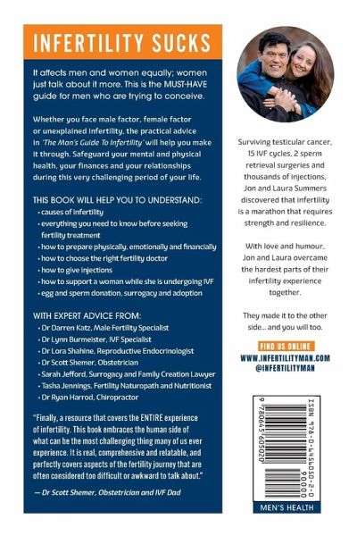 INFERTILITY SUCKS. It affects men and women equally; women just talk about it more. This is the MUST-HAVE guide for men who are trying to conceive. Whether you face male factor, female factor or unexplained infertility, the practical advice in The Man's Guide To Infertility will help you make it through. Safeguard your mental and physical health, your finances and your relationships during this very challenging period of your life. This book will help you to understand: · everything you need to know before seeking fertility treatment · causes of infertility · how to prepare physically, emotionally and financially · how to choose the right fertility doctor · how to give injections · how to support a woman while she is undergoing IVF · egg and sperm donation, surrogacy and adoption · With expert advice from: · Dr Darren Katz, Male Fertility Specialist · Dr Lynn Burmeister, IVF Specialist · Dr Lora Shahine, Reproductive Endocrinologist · Dr Scott Shemer, Obstetrician · Sarah Jefford, Surrogacy and Family Creation Lawyer · Tasha Jennings, Fertility Naturopath and Nutritionist · Dr Ryan Harrod, Chiropractor Surviving testicular cancer, 18 IVF cycles, 2 sperm retrieval surgeries and thousands of injections, Jon and Laura Summers discovered that infertility is a marathon that requires strength and resilience. With love and humour, Jon and Laura overcame the hardest parts of their infertility experience together.