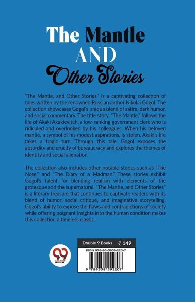 "The Mantle, and Other Stories" is a captivating collection of tales written by the renowned Russian author Nikolai Gogol. The collection showcases Gogol's unique blend of satire, dark humor, and social commentary. The title story, "The Mantle," follows the life of Akaki Akakievitch, a low-ranking government clerk who is ridiculed and overlooked by his colleagues. When his beloved mantle, a symbol of his modest aspirations, is stolen, Akaki's life takes a tragic turn. Through this tale, Gogol exposes the absurdity and cruelty of bureaucracy and explores the themes of identity and social alienation. The collection also includes other notable stories such as "The Nose," and "The Diary of a Madman." These stories exhibit Gogol's talent for blending realism with elements of the grotesque and the supernatural. "The Mantle, and Other Stories" is a literary treasure that continues to captivate readers with its blend of humor, social critique, and imaginative storytelling. Gogol's ability to expose the flaws and contradictions of society while offering poignant insights into the human condition makes this collection a timeless classic.