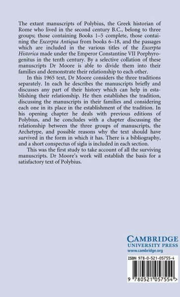 In this 1965 text, Dr Moore divides the extant manuscripts of Polybius, the Greek historian of Rome who lived in the second century BC, into their families, and demonstrates their relationship to each other. He considers the three traditions separately, and in each he describes the manuscripts briefly and discusses any part of their history which can help in establishing their relationship. He then establishes the tradition, discussing the manuscripts in their families and considering each one in its place in the establishment of the tradition. In his opening chapter he deals with previous editions of Polybius, and he concludes with a a chapter discussing the relationship between the three groups of manuscripts, the Archetype, and possible reasons why the text should have survived in the form in which it has. This was the first study to take account of all the surviving manuscripts.